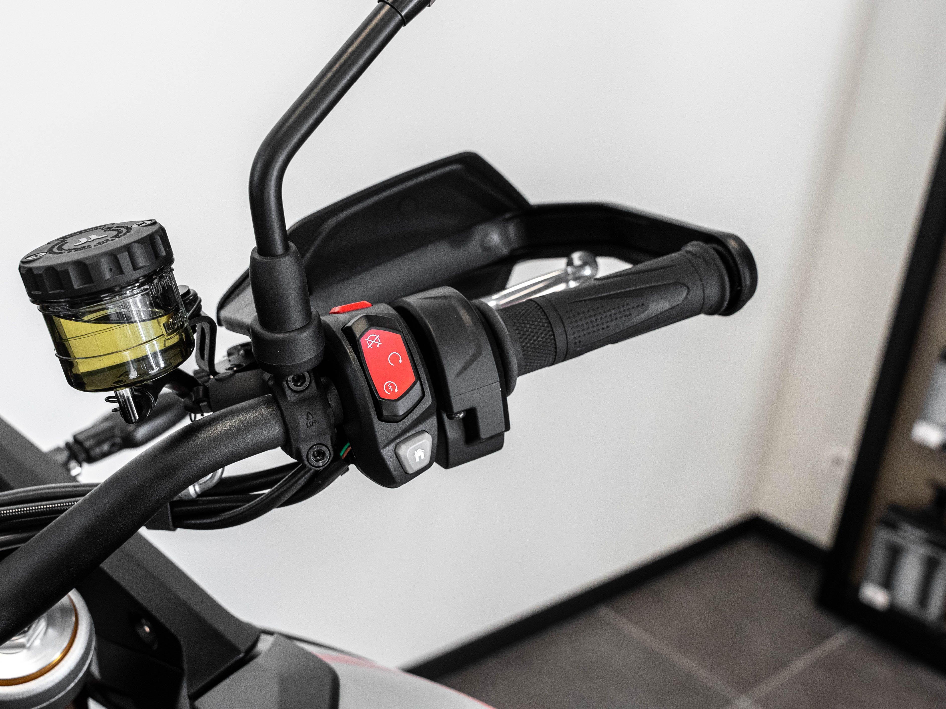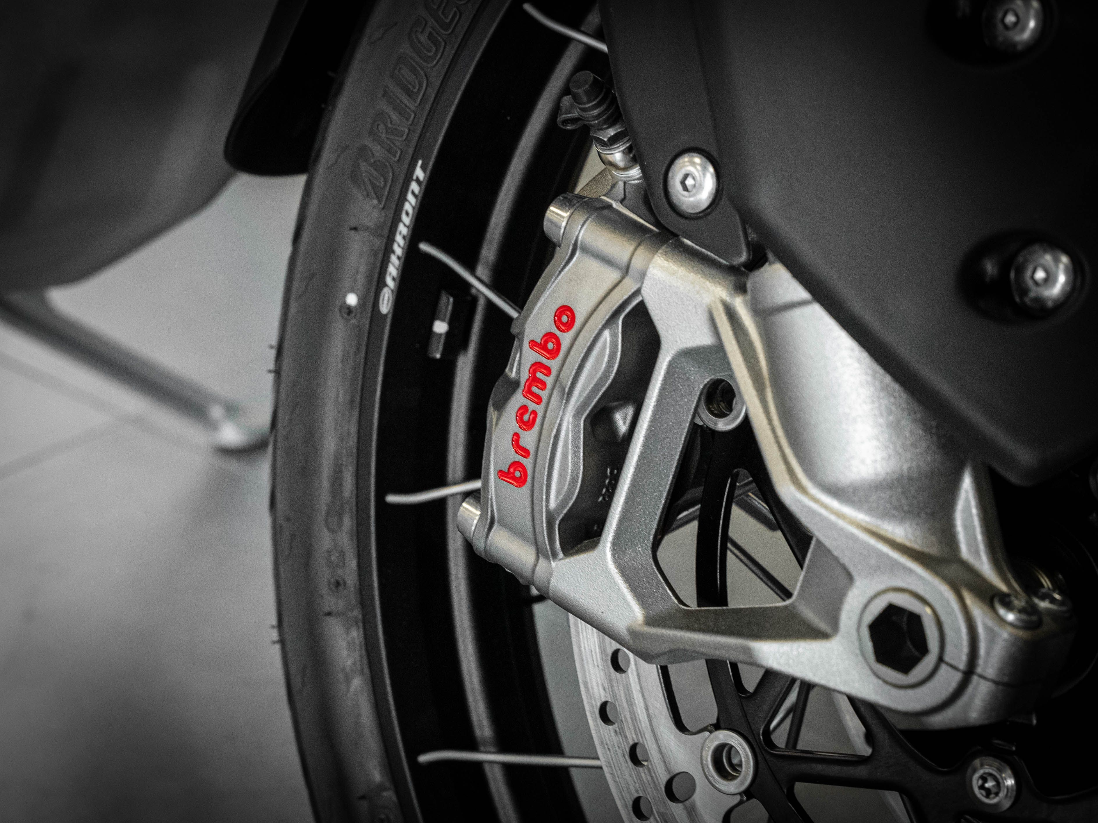 Frein avant : Double disque flottant de 320 mm, étriers monobloc 4 pistons Brembo Stylema. Maître-cylindre radial avant, ABS multi-mode, ABS optimisé pour les virages.